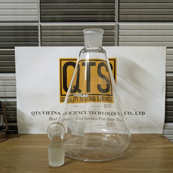 Bình tam giác thủy tinh có nút nhám được thiết kế chuyên dụng cho các thí nghiệm yêu cầu đóng kín bằng mối nối thủy tinh mài nhám (Ground Glass Joint), giúp hạn chế bay hơi, nhiễm bẩn và đảm bảo an toàn khi thao tác với dung dịch hóa chất.